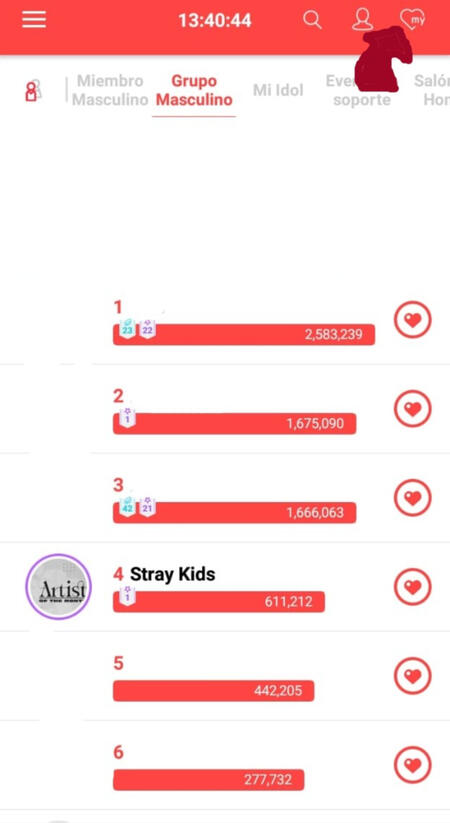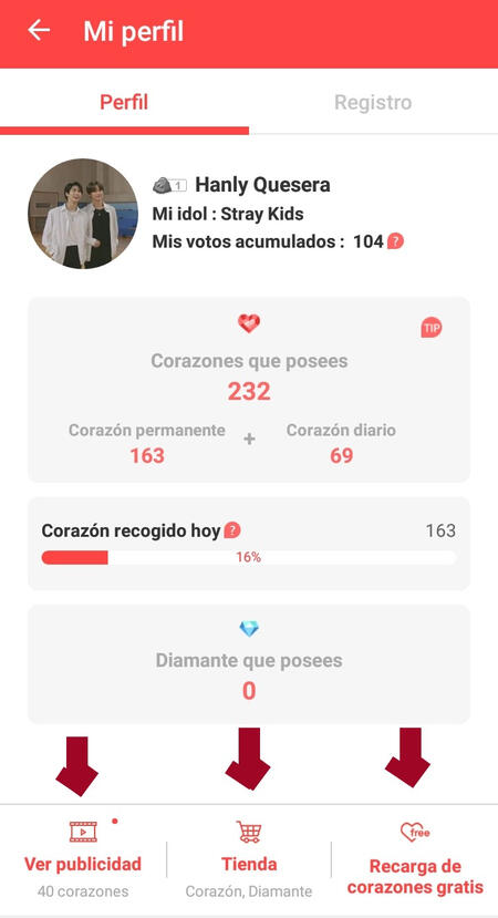 | Se resetean a las 23:30 kst. Se debe votar por skz todos los dias recibes 100 ❤️ cada día que entres a la app + bonus dependiendo tu nivel. De 20:00 a 23:30 kst es la hora caliente, cuando ingresas en este horario te entregan ❤️. Cada 10 min puedes enviar ❤️ a tus amigos, solo puedes enviar 3 veces al día, mientras más amigos mejor! Hay ❤️ aleatorios en la app, estos te pueden dar desde 7, 100, 1000 ❤️ | te dan 40 ❤️ por anuncio, puedes ver 10 anuncios por hora. Cuando subes una imagen en el board te dan 100 ❤️. Cuando votas 100 ❤️ te dan un 10% de lo que votaste |